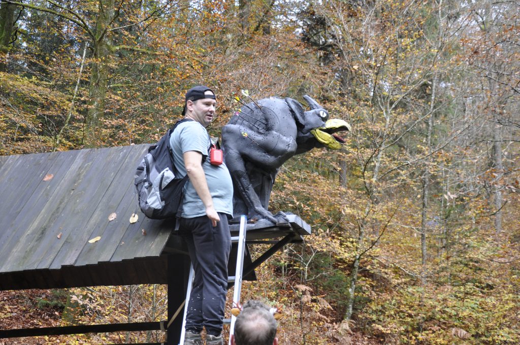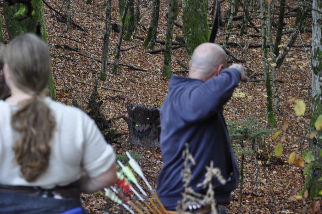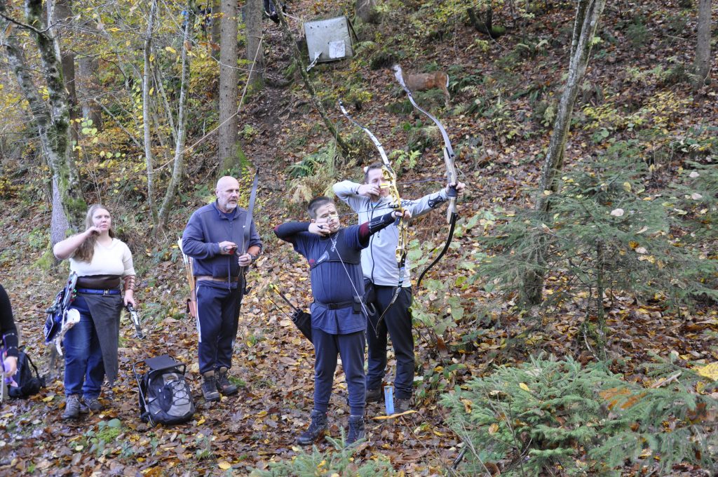 Po kratkem druženju in ogrevanju (da so prsti spet začutili tetivo), smo se pogumno podali na progo, kjer so nas pričakale tarče, kakršnih ne vidiš vsak dan – dinozavri, klovni, pošasti, mušnice in druge gozdne zverine, ki so mirno čakale, da jih zadenejo naše puščice. 😄 Nekatere pa so bile očitno začarane in so se nam spretno izmikale – no, vsaj tako se je zdelo po kakšnem bližnjem zgrešenem strelu. 🫣🎯
